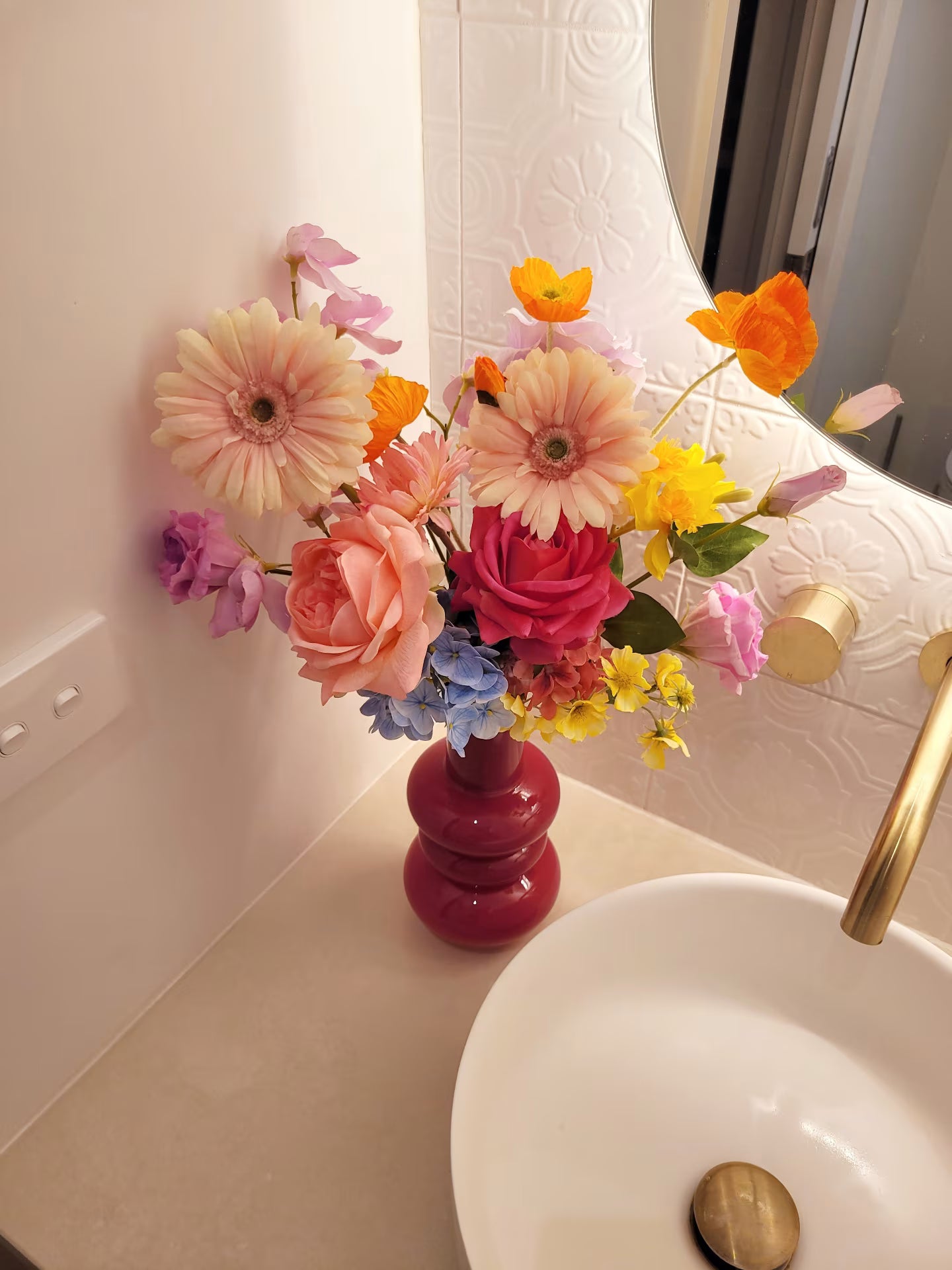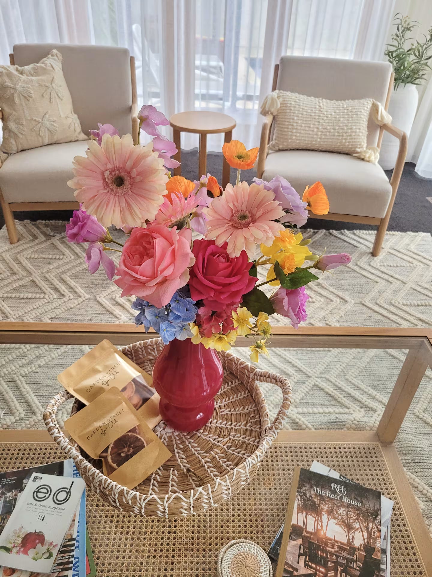 Daybreak is a bright, colour-forward faux flower arrangement designed to bring instant energy into a space. Featuring oversized daisy blooms balanced with complementary real-touch flowers, this piece feels playful yet refined. Created using premium silk flowers, it offers lasting impact without maintenance - a statement flower arrangement for homes, events and styled interiors.