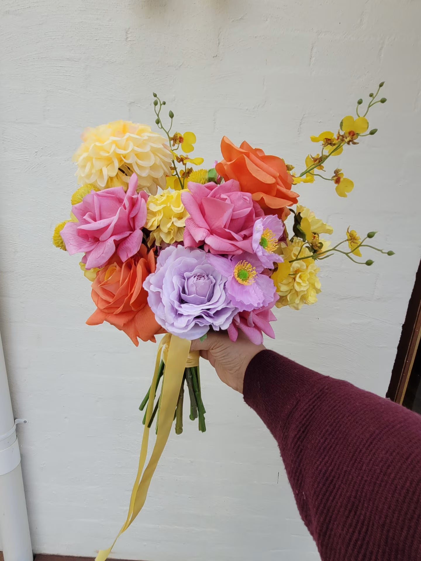 Artificial wedding bouquet in yellow, lolly pink, lilac, and orange tones